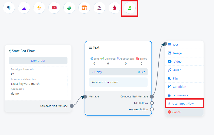 You may easily include your User Input Flow campaign into the flow of your other bot after it is set up. When a user encounters the User Input Flow component in your bot`s flow, they will be prompted with the questions defined in your campaign. Their responses will be automatically recorded in the specified custom fields.